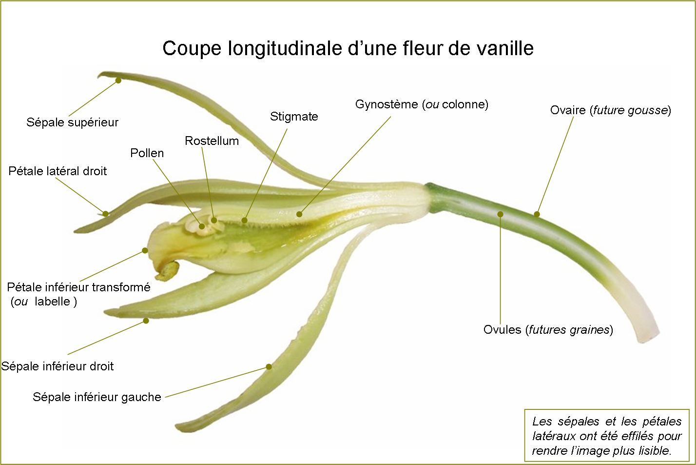 A l'origine, la vanille Bourbon poussait au Mexique. Sa pollinisation s'obtenait grâce à une abeille, 'la Mélipone' . Elle fut ramenée en Europe puis plantée à l'île de la réunion par Louis XIV (Famille Bourbon) vers 1700, où un garçon esclave de 12 ans, Edmond Albius trouva par hasard la technique manuelle de pollinisation. Elle finit son voyage à Madagascar quelques années plus tard . Aujourd'hui encore le savoir faire demande délicatesse et dextérité . C'est une fleur hermaphrodite où pistil et étamines doivent être fécondés pour voir naitre les gousses.